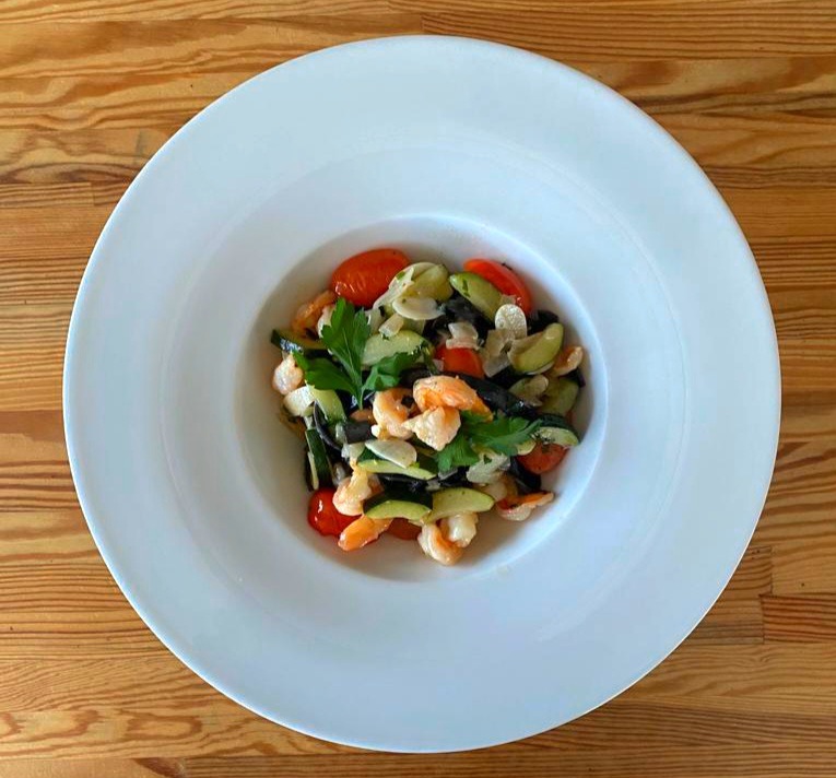 krewetki tygrysie w sosie mango z jarmużem i dzikim ryżem -